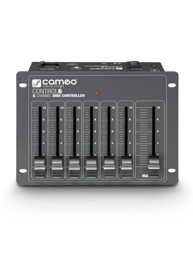 6 Channel DMX lighting desks have six channel faders and one master fader. Featuring a 3-pin DMX output and can be powered with the included power adapter or a 9V battery.