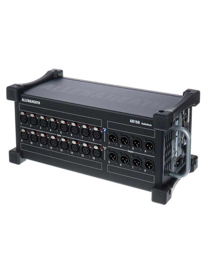 The Allen and Heath AB168 digital stagebox features 16 XLR inputs with phantom power indicators and 8 XLR outputs complete. The AB168 runs on CAT 5 Ethernet/Ethercon cable and can be positioned up to 100m from the mixer for maximum flexibility.
