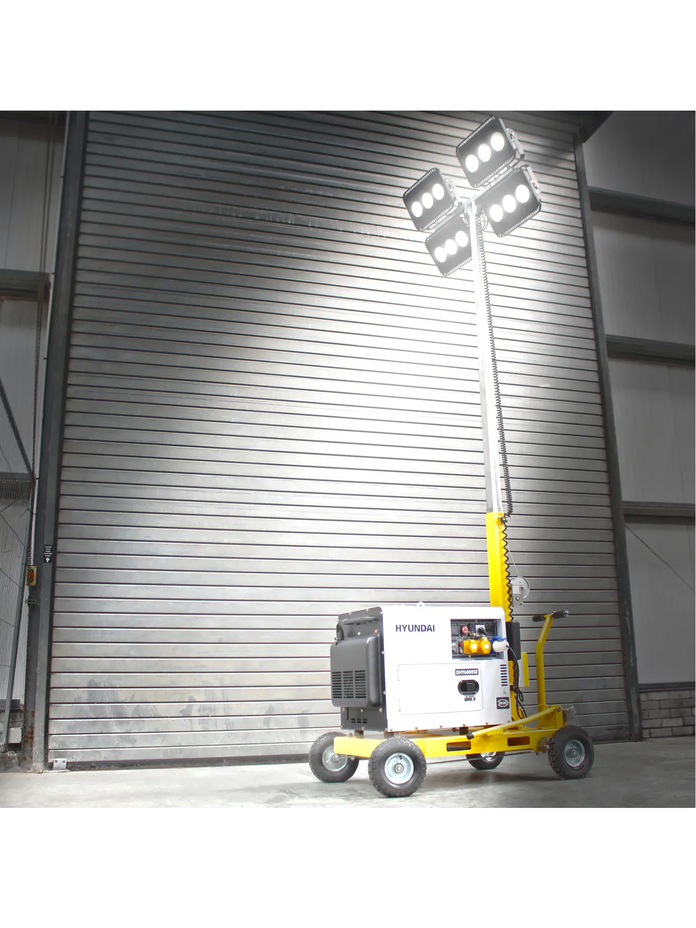 The easy to transport LT800-LED-D lighting tower features 4 pneumatic off road tyres with rapid one person deployment. Simply push the lightning tower into place, apply the brake, lower the stabiliser legs and erect the mast using the single operator handle. Towering 5 metres in height from the ground, the LT800-LED-D provides excellent illumination across large areas requiring temporary lighting.