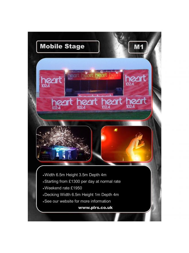 A non-refundable deposit is required to confirm booking and reserve equipment until 28 days prior to the date of hire at which time full cleared payment of the balance is due. Where payment is not received by the required date, we reserve the right to treat the booking as cancelled. Upon receipt of full payment PLRS will provide equipment/services as described on the attached quotation/invoice in accordance with the terms and conditions listed below. If the hirer cancels the booking, no refund is payable but PLRS may transfer the booking to a future date at their discretion and in consulation with the hirer. The mileage charges will be applied as well as the charge cost. Mileage charge is per mile for each mile travelled. Electricity supply is to be provided by the hirer. (As a general rule 10 - 15kva at 16 amps is required or 2 separate power supplies from a mains source. This may vary depending upon the equipment to be used.) The hirer is responsible for the safe and secure passage of the stage to and from the proposed site. On soft or infirm ground we suggest either a tractor or similar towing vehicle to be available to tow the stage on or off the site if required, or that a temporary ‘road surface’ is prepared. (Basically a 7.5 ton truck can get stuck on a wet field and can churn up a lot of mud if preventative measures are not applied. On firm, dry ground this does not apply.) The hirer assumes total responsibility for the full replacement cost of all hired equipment, should it be damaged in any act of aggression, vandalism, theft, civil dispute, or similar. If equipment is to be left on site overnight sufficient security must be provided. Where appropriate, a number of spare lamps and any other equipment will be provided. No equipment must be changed, moved or adjusted by any person apart from our engineers or persons designated to do so by prior arrangement. The ‘get in’ and ‘get out’ time will be assessed upon confirmation of booking. At some events set-up should be conducted the previous day and/or break down may happen the following day. This may incur overnight expenses. This will be confirmed upon final booking. Unless otherwise agreed in writing, when providing a sound system, PLRS will supply industry standard equipment suitable for a large live band and operate this using our standard channel allocations and set-up. Details available upon request. We will not alter our set-up to a specific band's requirements unless this has been discussed prior to quotation as additional charges will apply. Hire duration includes time taken travelling to and returning from events. For billing and logistical purposes a "day" begins at 7am and ends at 1am the following morning. A full day is charged for any part thereof. Events requiring earlier starts or later finishing will be required to book equipment for the previous or following day and may incur overnight expenses. Multi level venues should be made level and adequate to handle the volume of equipment, and be kept free from the public and obstructions during set-up, performance and de-rigging. A parking space as close to the loading point or stage point should be provided and kept free at all times. It is the hirer's responsibilty to inform PLRS of any potential access difficulties (eg stairs, slopes, barriers) prior to confirming booking. PLRS reserve the right to refuse set-up without refund where obstructions are encountered of which they had not been previously advised. All equipment hired must be installed by a qualified electrical engineer / qualified sound engineer who should inspect and test the hired equipment prior to its use. We cannot accept responsibility for damage to buildings, property or personal injury caused by any means with relation to the equipment. Neither can we be expected to safeguard any performer’s equipment or maintain security around the stage; this should be set up prior to the stage arrival. PLRS reserve the right to evacuate the performance area in conditions which constitute a risk to any persons safety (eg extreme weather). PLRS take no responsibility for any delays resulting from unforeseeable events such as traffic accidents, congestion or road closures. Reasonable allowances will be made for such events and every effort made to minimise any disruption caused by such incidents. Hirers will be contacted accordingly. All hired equipment remains the property of the company and must be surrendered on request. Hired equipment must not be moved to another location without prior notification and consent from ourselves. We supply the stage / audio equipment by request, as a business, and hold no responsibility for supplying any licences or gaining authority needed to provide such entertainment. These are the sole responsibility of the hirer to provide if necessary. Signing of the hire agreement form confirms acceptance of all of the above terms and conditions by the hirer and the organisation they represent. Receipt of payment also constitutes acceptance of the above terms and conditions which are supplied with all invoices and quotations.