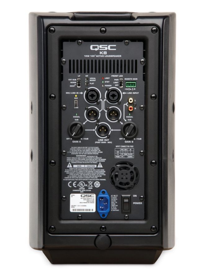 The QSC K8 Active speaker is a fantastic choice for reliability and high quality audio delivery in a small box. 1000W continuous output. The K8 features a variety of XLR, 1/4" and phono inputs and a built-in QSC EQ. Flying compatible with built-in M10 rigging points.