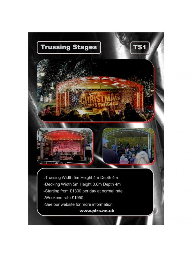 Our trussing stages provide an impressive, strong, weather proof, temporary structure. Our most popular trussing stage, (TS4) as with all trussing stages, is constructed on site.